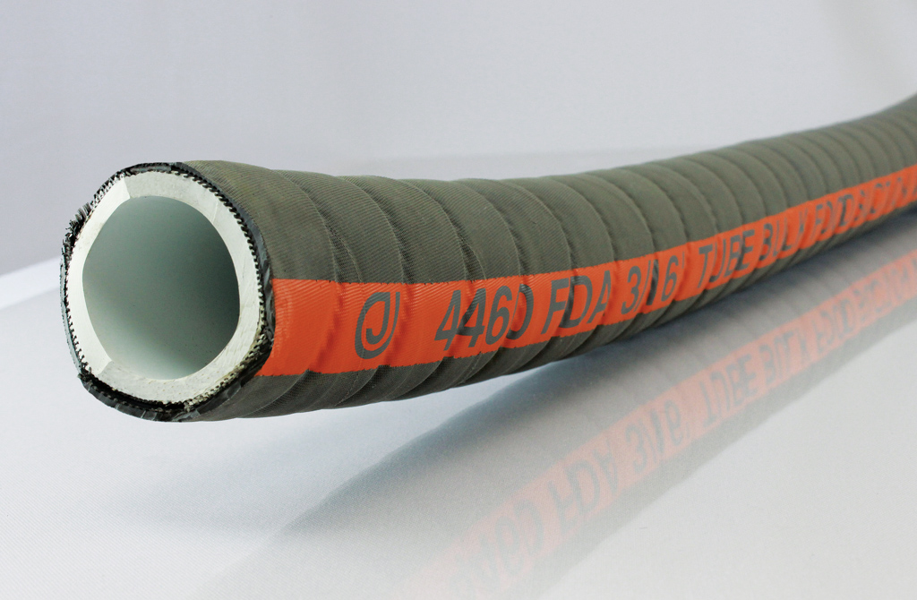 CONSTRUCTION:Tube is white natural rubber (NR), 3/16” thick, FDA Grade.Cover is natural rubber, gray with flat corrugations.Two-ply reinforcement with a steel wire helix.